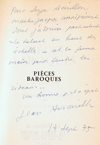 Pour Antigone dans la mise en scène de Nicole Anouilh, le budget alloué par Radifé Harry-Baur étant si modeste, il reprend des tissus de ses décors de classiques pour construire, avec l’aide du Régisseur François Sourbieu, selon les plans fournis par Jean-Denis Malclès, le décor. Cette action surprendra Jean Anouilh lui-même qui s’en souviendra.
