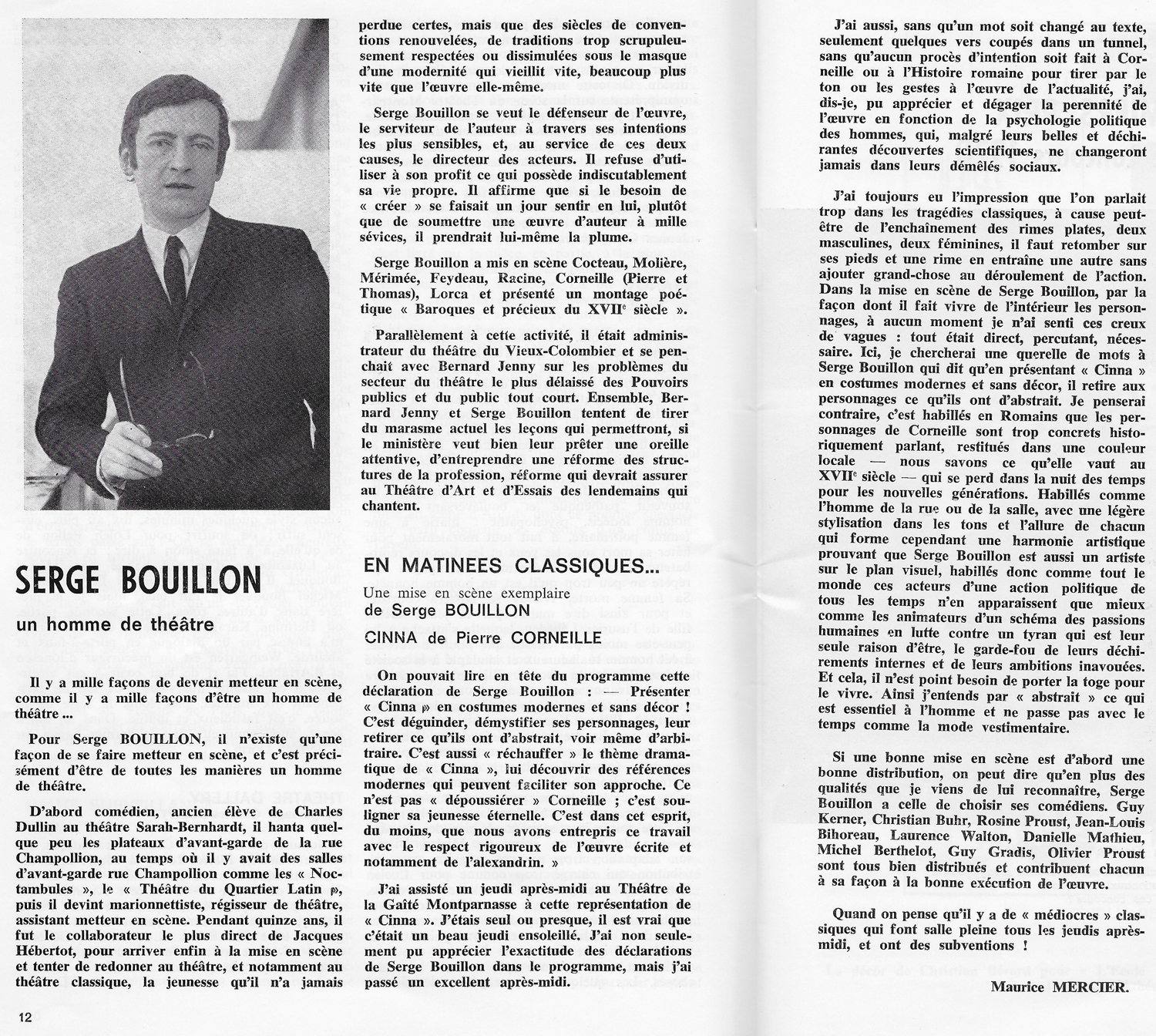 Serge Bouillon devient aussi l'assistant de tous les metteurs en scène qui vont travailler sur ce plateau illustre, étant ainsi au plus près de la création des spectacles.