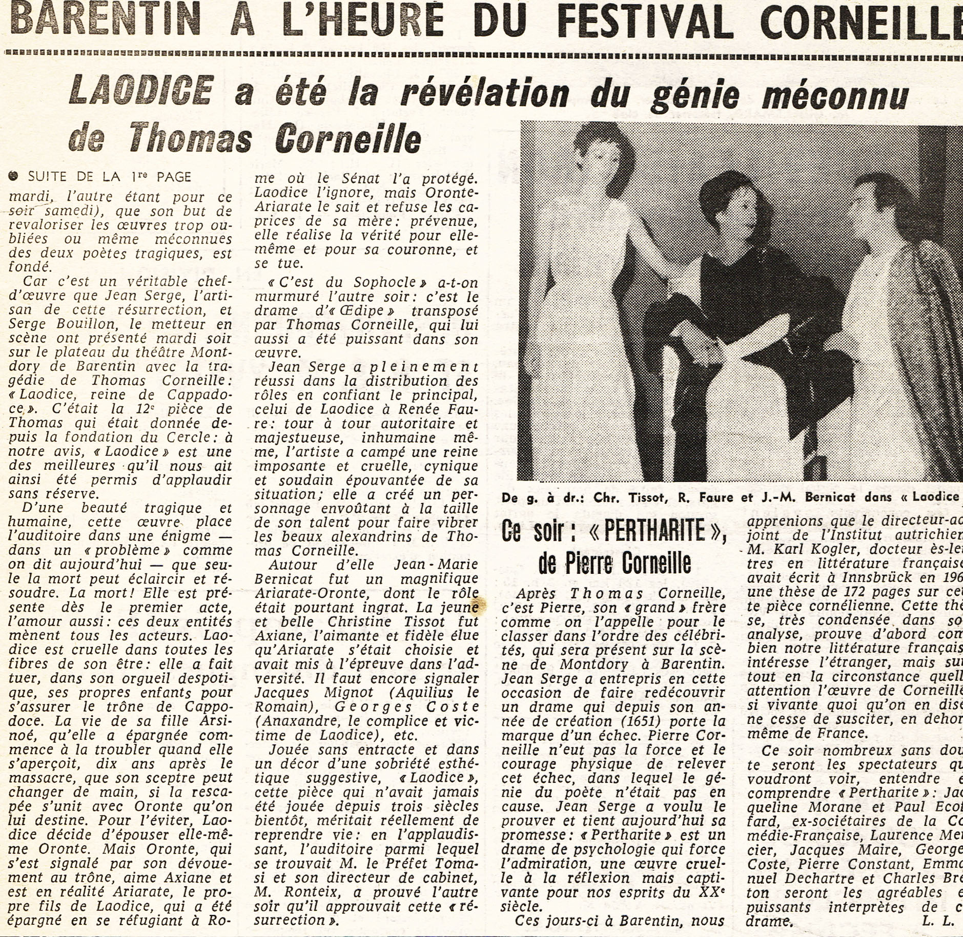Il participera à deux festivals Corneille de Barentin en montant Pulchérie de Pierre Corneille en 1966 et Laodice de Thomas Corneille en 1967 avec Renée Faure, Christiane Tissot et Jean-Marie Bernicat dans des décors et costumes de Michel Juncar
