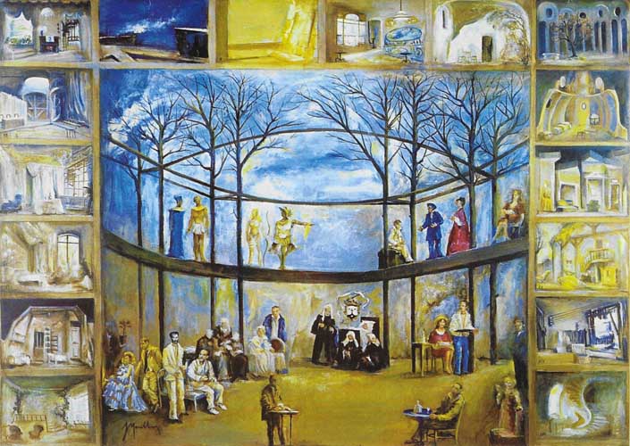 Pour répondre à une commande de l'A.R.T., Jacques Marillier a choisi de synthétiser son œuvre scénographique, selon la technique italienne du XVIème siècle, par un ensemble de cartouches venant cerner le dispositif de base qu'il avait imaginé pour l'alternance de 23 spectacles présentés par la Compagnie Jean-Laurent Cochet