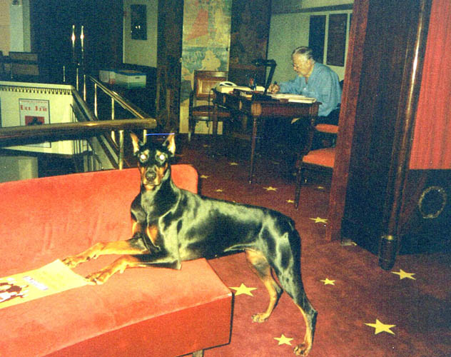 Serge Bouillon travaillant au Théâtre Comédia, au premier plan, sa chienne Dobermann, Romy