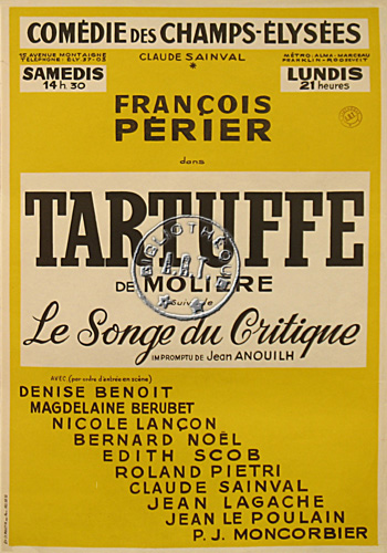 Magdelaine BERUBET (Madame Pernelle), Nicole LANCON (Elmire), Denise BENOIT (Dorine), Bernard NOËL (Damis), Edith SCOB (Mariane), Roland PIÉTRI (Cléante), (Flipot), Claude SAINVAL (Orgon), Jean LAGACHE (Valère), François PERIER (Tartuffe), Jean LE POULAIN (Monsieur Loyal), P.J. MONCORBIER (un Exempt),