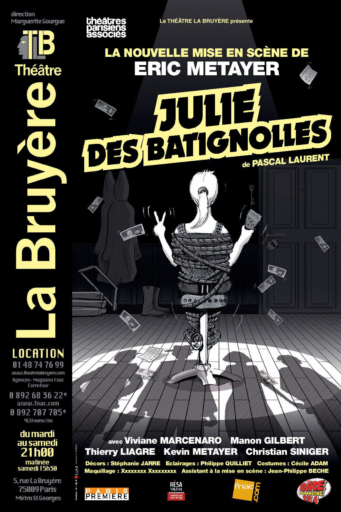 « Quand, en sortant des 39 marches, Pascal Laurent me parle de Julie des Batignolles, j’ai tout de suite accroché, retrouvé une autre forme de rapport au cinéma mais, cette fois, de chez nous. Les truands, Paname, l’argot fleuri, toute l’ambiance des films du Monocle, des Gorilles et de Monsieur Michel Audiard mais aussi d’autres plus anciens comme Fric Frac… Voilà le défi : reproduire cela sur scène en inventant encore une autre forme de clin d’œil au 7e art ; cette fois, en noir et blanc, des flashbacks, gros plans… Réinventer ces casses ratés, les aventures des pieds nickelés.