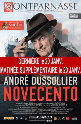 Novecento naît en 1920 sur un paquebot. Abandonné sur un piano il est élevé par l’équipage et ne connaît pas d’autre univers que la mer. Il joue au piano tous les airs qu’il entend, il enthousiasme les foules, fascine, intrigue. Il est un phénomène pour tous ceux qui l’écoutent ! Il devient le plus grand pianiste au monde, on l’incite à descendre mais jamais il ne mettra un pied sur la terre : un clavier trop grand pour lui… André Dussollier donne vie à ce conte avec virtuosité, espièglerie, chaleur et génie accompagné par un quatuor de jazz, il tangue, virevolte et embarque les spectateurs dans la fantastique histoire de Novecento !