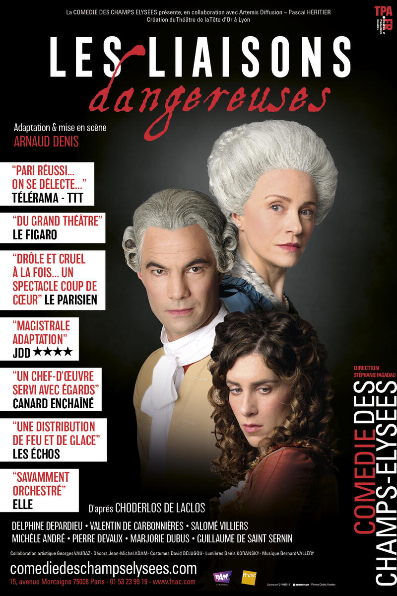 Delphine DEPARDIEU (Madame de Merteuil), Valentin DE CARBONNIERES (Le Vicomte de Valmont), Salomé VILLIERS (Madame de Tourvel), Michèle ANDRÉ (), Pierre DEVAUX (), Guillaume DE SAINT SERNIN (), Marjorie DUBUS (Cécile de Volanges),
