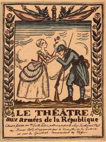 Un an avant l'officialisation du Théâtre au Front, Émile Fabre, administrateur de la Comédie-Française, avait fondé le Théâtre aux Armées, secondé par Alphonse Séché, dans le but « d'offrir, avec le concours gracieux des meilleurs artistes, des représentations théâtrales aux soldats du front ». Dans les programmes se côtoient les noms des plus grandes salles : la Comédie-Française, le Théâtre Antoine, le Théâtre Michel, le Palais-Royal, l'Odéon, le Théâtre de la gaieté, l'Opéra... Sarah Bernhardt, à peine amputée, se joint aux tournées harassantes, pelotonnée dans sa petite chaise à brancards « souriant à tous les regards pour qu'on n’ose pas avoir pitié ! ».