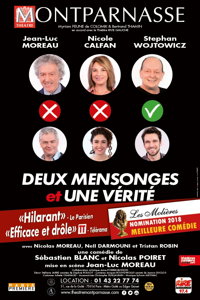 RésuméNe dites jamais à votre femme qu'elle ne vous surprend plus. Le soir de leur 27ème anniversaire de mariage, Philippe ne comprend pas que Catherine ne veuille pas admettre qu'au bout de tant d'années, ils ont la chance immense de ne plus pouvoir se surprendre. Pour lui prouver qu'il a raison, il lui propose un jeu. La règle est simple : chacun doit donner trois anecdotes le concernant, contenant deux mensonges et une vérité. Si Catherine trouve tout de suite la vérité de Philippe, lui, va vivre un enfer en essayant de découvrir celle de Catherine... Et ce n'est pas l'aide d’Édouard, son meilleur ami un peu gaffeur qui va lui faciliter la tâche.