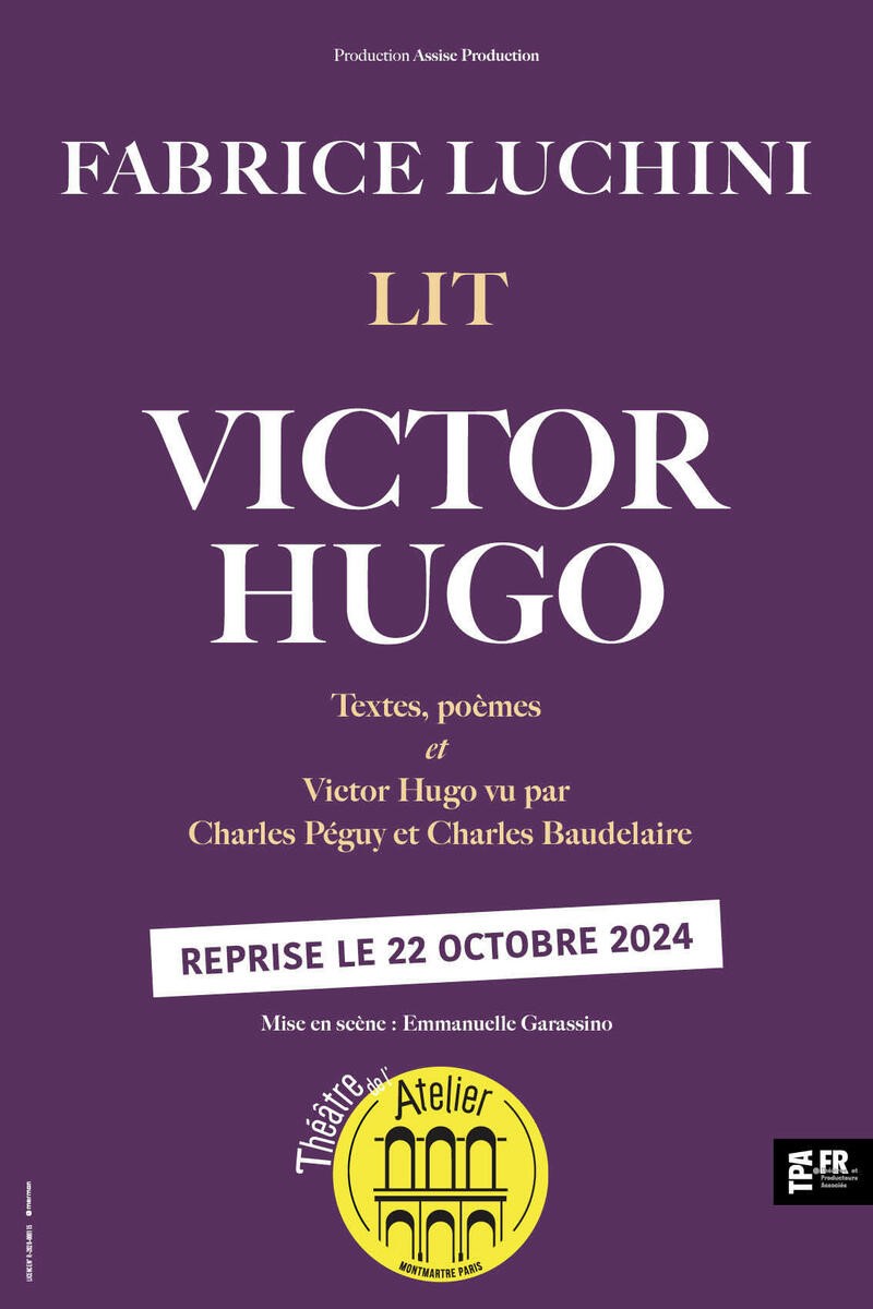 « J’ai fait une première lecture de textes et poèmes de Victor Hugo devant le public en juin 2021, dans les jardins de la Maison de Chateaubriand. Contrairement à la phrase d’André Gide, pourtant fin analyste, « Quel est le plus grand poète français ? Victor Hugo, hélas », il y a pour moi des éblouissements dans les écrits de Victor Hugo qui dépassent l’artisan doué, et des bonheurs d’écriture qui surgissent de sa création très féconde. Parallèlement au spectacle sur La Fontaine et le confinement que je joue depuis 2022, j’ai eu envie de revenir à cet exercice plus austère, afin de proposer au public une pure lecture de textes, et notamment le sublime Booz endormi, que Marcel Proust définissait comme le plus beau du 19ème siècle, des poèmes sur la mort de sa fille ou des commentaires d’écrivains comme Charles Baudelaire et Charles Péguy sur Victor Hugo. La lecture démarre au moment de son exil à Jersey et Guernesey, et évoque notamment la mort de sa fille Léopoldine. Je dédie cette lecture à la réalisatrice Sophie Fillières, qui nous a quittés cet été 2023, avec qui j’ai eu l’immense plaisir de préparer un film sur Victor Hugo.» Fabrice Luchini