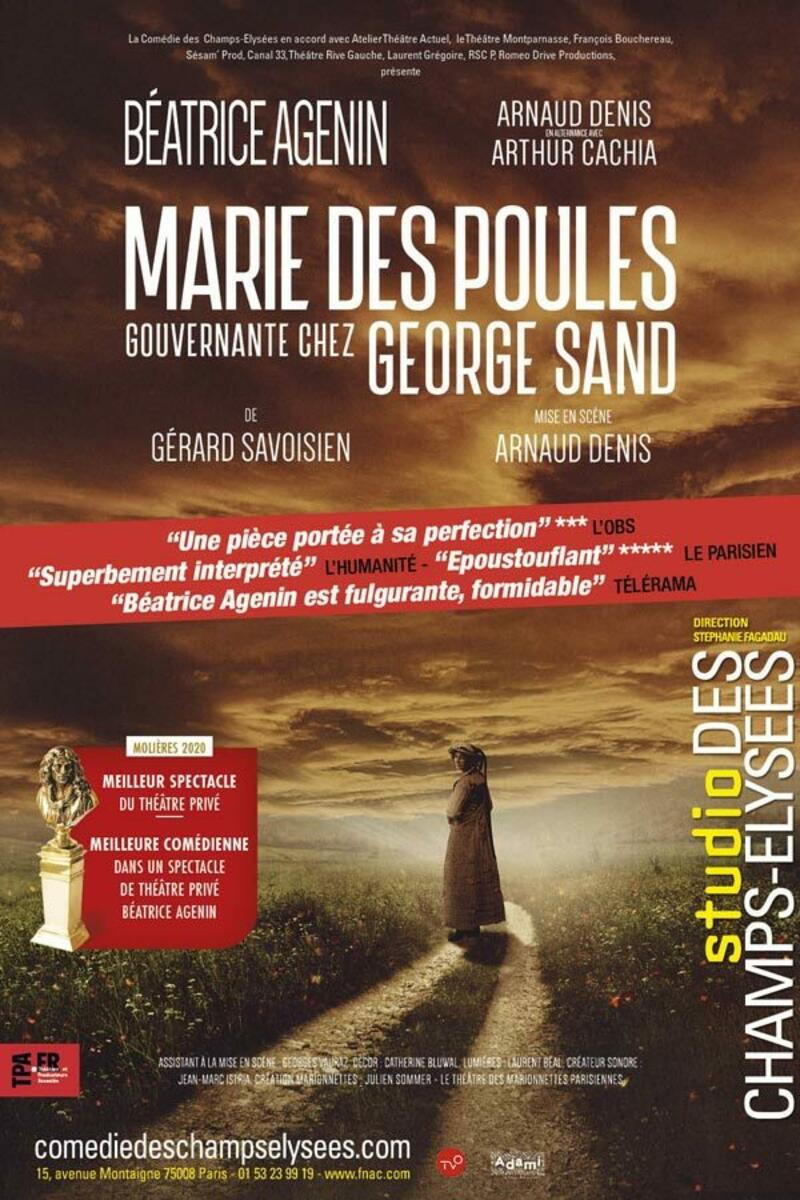 Lorsque, à onze ans, Marie Caillaud entre à Nohant a service de George Sand, elle ne sait pas encore qu’on l’appellera Marie des Poules, la servante qui va chercher les œufs au poulailler. Elle ne sait pas non plus qu’elle y apprendra à lire, à écrire, à jouer la comédie et à interpréter 35 pièces écrites par George Sand. Elle sait encore moins qu’elle éprouvera les souffrances d’un amour qui va la marquer à vie. Maurice, le fils de George, entretiendra avec elle une liaison qui perdurera pendant plusieurs années. Quelle sera l’attitude de George Sand ? De Maurice ? Les conventions sociales briseront elles les espérances de Marie ? Quel sera le destin de Marie des Poules ?