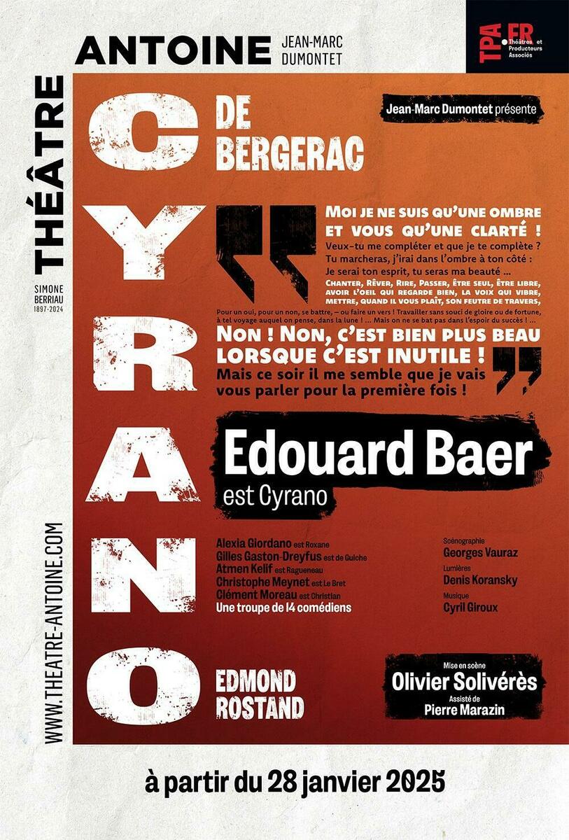 Tout le monde se trompe sur Cyrano. Cyrano est un Roc....friable, multiple, sensible, entier, éperdu, brillant, fidèle, abandonné par les grâces et pourtant étincelant de cœur et d’âme. A côté de Cyrano, nous sommes tous gris, définitivement gris. Sacré pari de tenter d’approcher cette icône du répertoire. Amoureux des mots, de la langue, de la poésie, homme de troupe, passeur d’émotions, Edouard Baer rencontre Cyrano comme une évidence. Sous la houlette d’Olivier Soliveres, une troupe de 14 comédiens servira un chef d’œuvre où tragique et sublime se conjuguent dans une langue hors du commun.