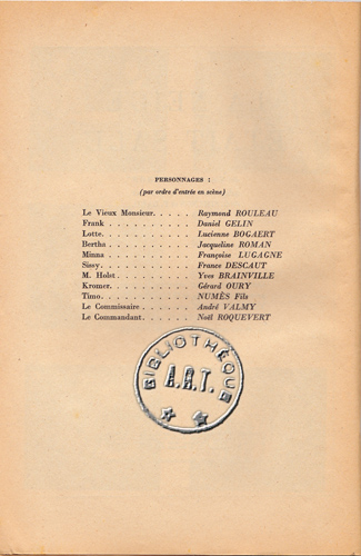 La distribution: Raymond Rouleau, Daniel Gélin, Lucienne Bogaert, Jacqueline Roman, François Lugagne, France Descaut, Yves Brainville, Gérard Oury, Numès Fils, André Valmy et Noël Roquevert | ||
