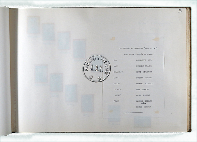 7. Distribution par ordre d'entrée en scène : Antoinette Moya, Caroline Cellier, Henri Virlojeux, Danièle Delorme, Bernard Rousselet, René Clermont, André Thorent, Monique Lejeune et France Descaut